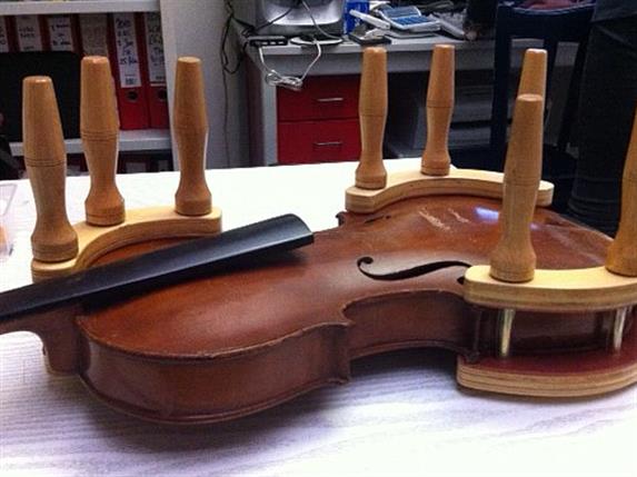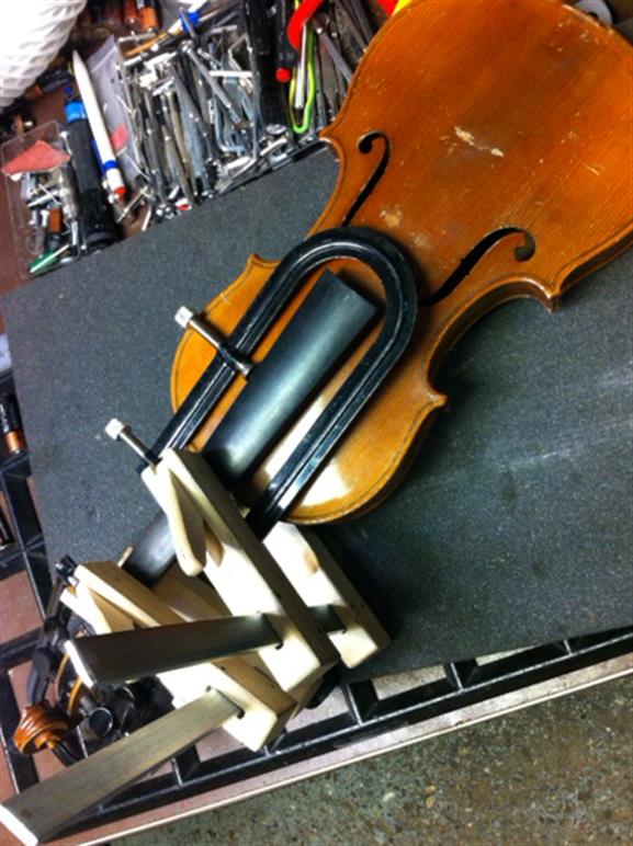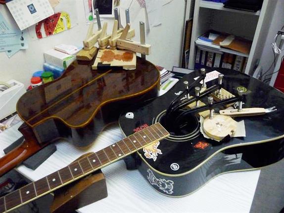 Regelmatig liggen ze in de lijmklemmen: Violen, die zijn binnen gebracht voor kleine reparaties of een opknapbeurt. Maar ook gitaren, die bijvoorbeeld gevallen zijn, kunnen veelal in de lijmklemmen worden gezet en hersteld worden. Al heel veel klanten zijn blij de deur uitgegaan met hun weer glimmende instrument. Vooral in het repareren en opknappen van violen is Stage Music Service gespecialiseerd. Kammetjes op maat maken, nieuwe mechanieken monteren, snaren opzetten, stemmen en bij hele oude violen wordt altijd even de bouwer nagecheckt, want wie weet… Aan elektrische gitaren worden alleen kleine reparaties verricht, zoals: