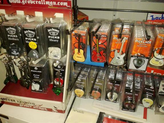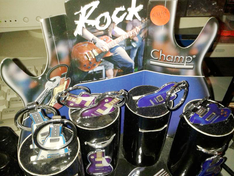 sleutelhangers met gitaren (verschillende modellen), mondharmonica’s en bekkens.